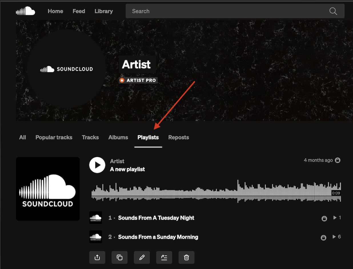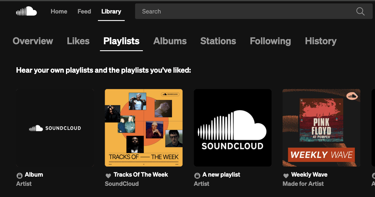 Playlists auf SoundCloud sind Sammlungen oder „Alben“, die Sie mit eigenen oder fremden Tracks erstellen können. Sie können Playlists, die Sie geliked oder erstellt haben, auf Ihrer Bibliotheksseite über den Playlist-Tab ansehen (gilt für App und Desktop).