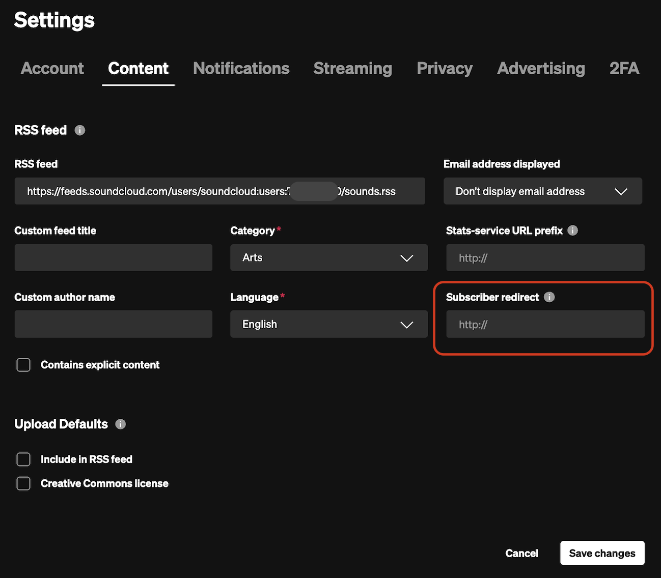 Please note: If you want to continue to use your SoundCloud RSS feed, do not put anything into this field. By adding a URL or text in this box, you will break your RSS feed.