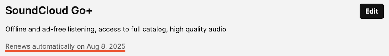The monthly SoundCloud Go subscription renews every 30 days, so your credit card will automatically be billed every 30 calendar days. This means the payment may be taken out on a different date each month.
