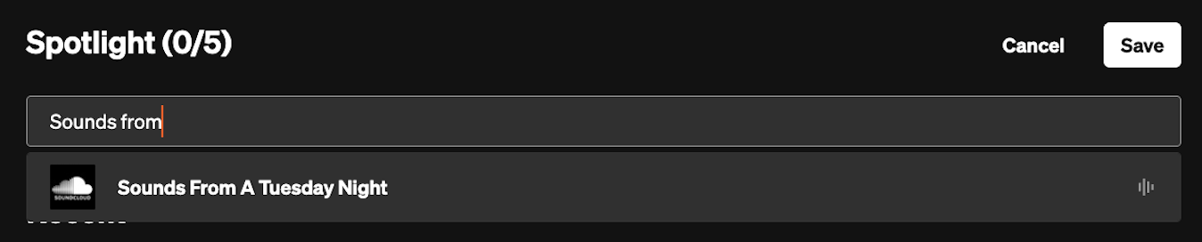 El menú desplegable solo mostrará las últimas 15 pistas o listas de reproducción disponibles públicamente subidas a tu cuenta. Una vez que hayas añadido los elementos seleccionados a tu Destacado, recuerda hacer clic en el botón "Guardar".