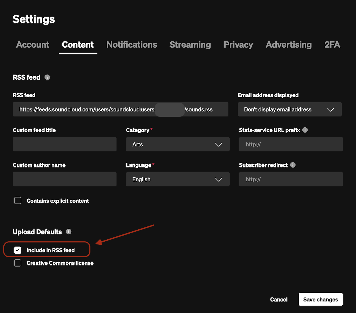 Para asegurarte de que las pistas que subas se incluyan en tu feed RSS, debes marcar la opción "Incluir en el feed RSS".