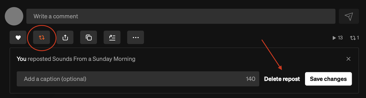Clicca sul pulsante di ripubblicazione sotto qualsiasi brano o playlist per aggiungerlo in cima al tuo profilo e condividerlo nel Feed dei tuoi follower. Per rimuovere un elemento ripubblicato dal tuo profilo, clicca nuovamente sul pulsante ‘ripubblica’.