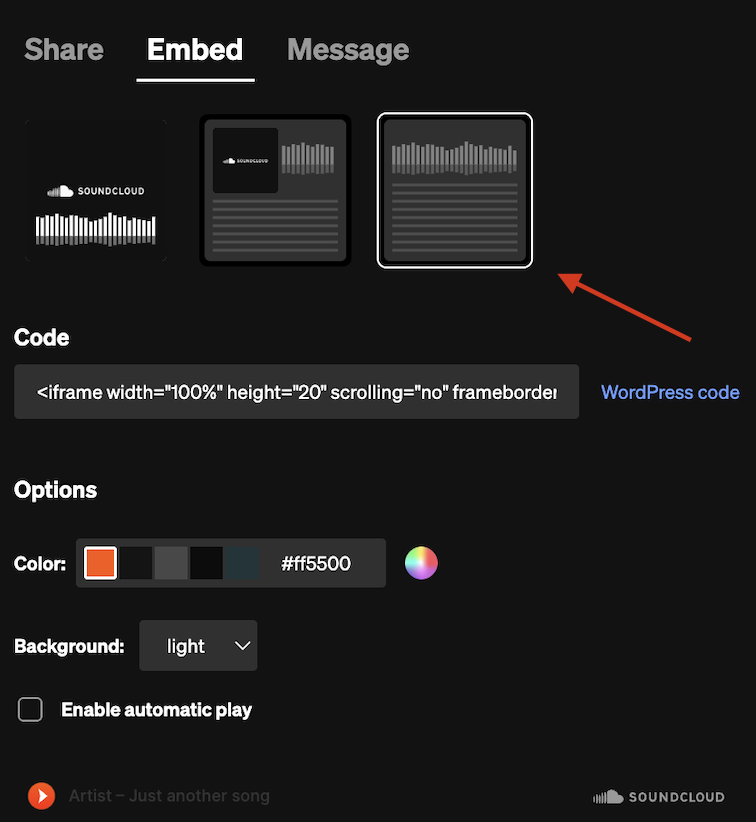 Você pode acessar o Mini player através do botão Compartilhar da sua faixa, na aba Incorporar, como a terceira opção disponível: