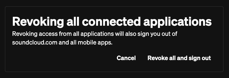 Se você acredita que o acesso à sua conta do SoundCloud foi comprometido, recomendamos usar o recurso “Revogar tudo” para revogar todo o acesso à sua conta. Isso pode ser encontrado rolando até a seção “Aplicativos conectados” das suas configurações, https://soundcloud.com/settings: