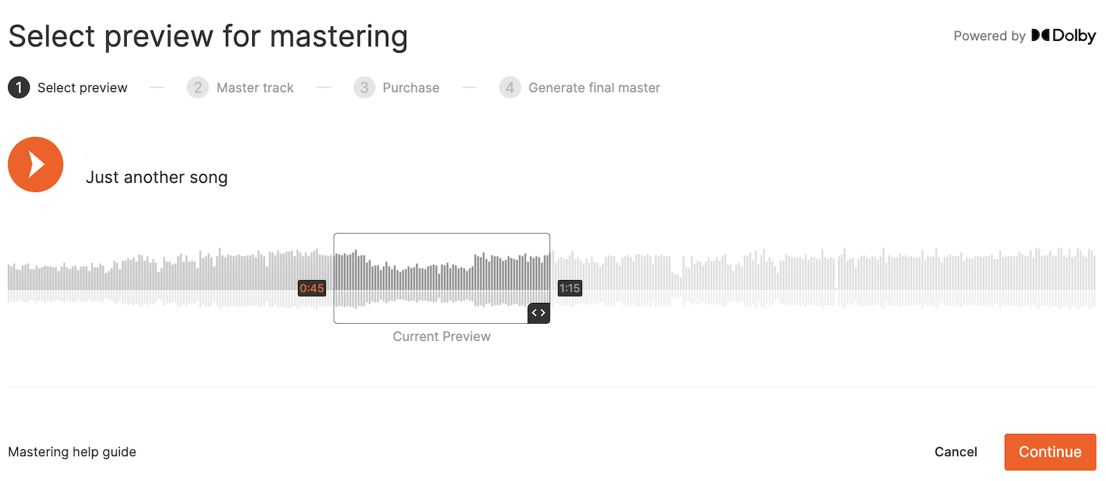 Nós damos esse controle a você. Achamos que você sabe melhor qual parte da faixa dará os resultados que você procura. Antes de enviar a faixa para o processamento, você seleciona uma prévia de 30 segundos para usarmos. Se quiser ouvir como os estilos de masterização se aplicam em diferentes partes da música, basta voltar ao passo 1, selecionar outra parte da música e tentar novamente.